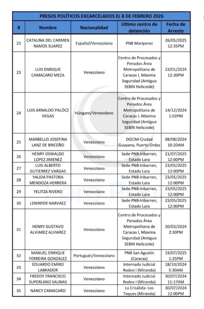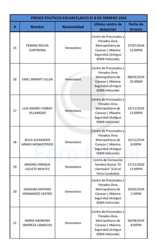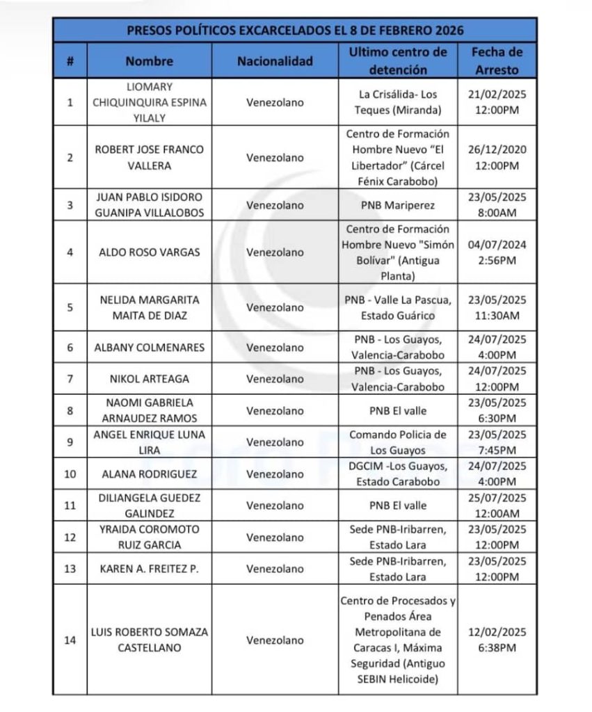 Estas liberaciones, que son con medidas cautelares, se dan en el marco de un proceso de excarcelaciones anunciado por el presidente del Parlamento, Jorge Rodríguez, hace un mes, luego de la captura de Maduro por parte de Estados Unidos. Con información EFE
