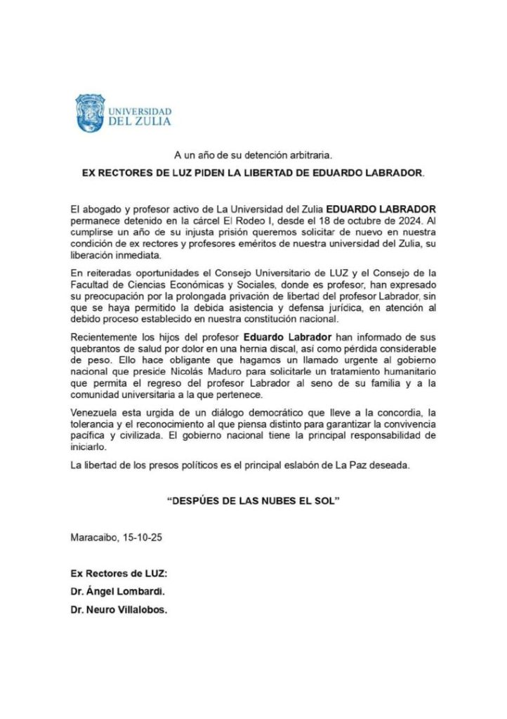 Especial Maracaibo, 15-10-25- Los ex rectores de la universidad del Zulia, Ángel Lombardi y Neuro Villalobos, solicitaron, en carta pública, al gobierno de Nicolás Maduro una medida humanitaria que permita la libertad del abogado y profesor activo de LUZ, Eduardo Labrador.