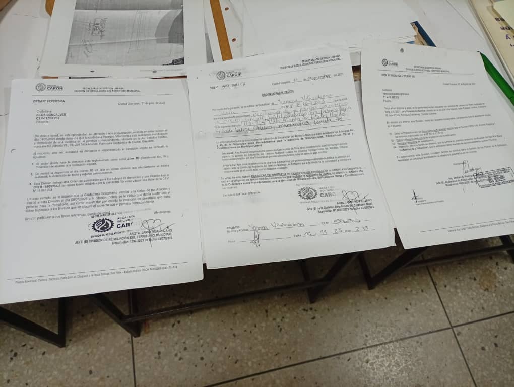 El clímax de la denuncia toma forma de papel.  El ingeniero Simón Yegres, en representación del Colegio de Ingenieros de Ciudad Guayana,  como responsable de la OCEPRE, sostiene que esta validación de lo ilegal tiene una larga historia documentada por el gremio.  Solamente entre el 2006 y el 2013 registraron 75 casos de permisos concedidos por Ordenamiento Urbano de la Alcaldía de Caroní, de los cuales 68 evidencian violaciones reiteradas al marco legal de ordenamiento municipal.