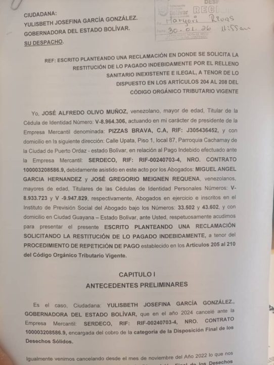 Ciudad Guayana (Gustavo Montaña / CNP 8235) – La brisa del Caroní hoy arrastra algo más que humedad; arrastra la indignación de un sector comercial que se siente asfixiado por facturas de servicios inexistentes. El pasado viernes 30 de enero de 2026, lo que comenzó como el cansancio de un comerciante local —quien, según relatan sus abogados, se hartó de «reuniones de puro bla, bla, bla»— se cristalizó en una acción administrativa formal ante la Gobernación del Estado Bolívar.